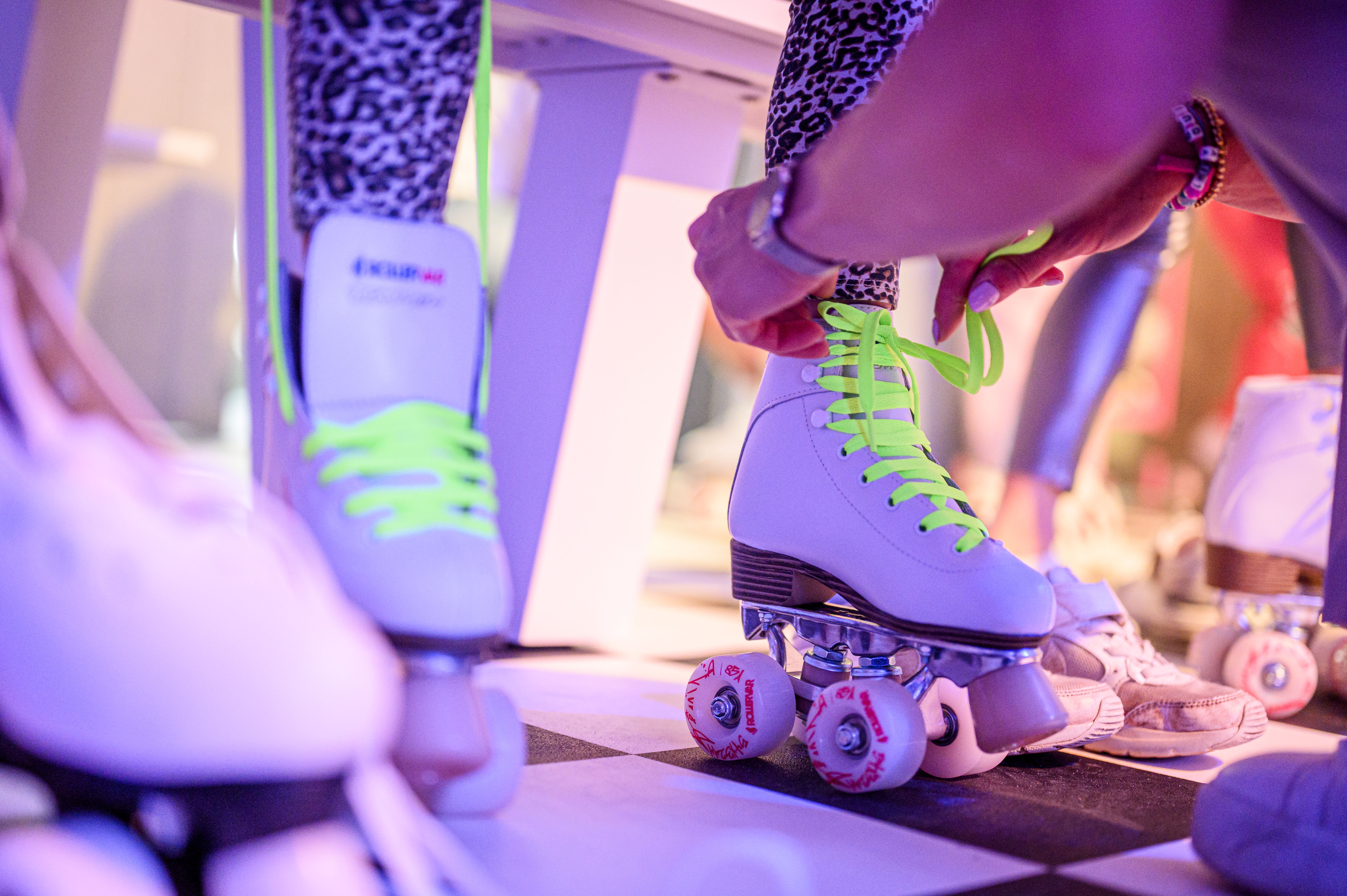 Van juni t/m november 2024 hebben wij de Oude Drukpershal in Enschede omgetoverd tot Roller Disco. In de ruimte waar vroeger de papieren rollen opgeslagen lagen voor de krant, kon je onder de neon lichten, discoballen en meeslepende tonen van de muziek jouw rolschaats skills oefenen en tonen.